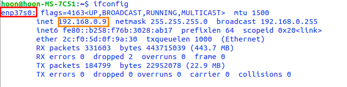 빨간색 네모로 표시한 곳이 이더넷 이름이다. 이것을 확인한다. ip는 대역대만 알면 된다.