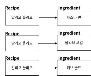 Recipe는 모두 중복이지만 Ingredient만 달라지는 결과를 얻는다. 알리오 올리오의 재료가 100개라면 알리오 올리오라는 레시피 데이터도 똑같이 100개를 조회해야 하기 때문에 낭비다. 이런 이유로 JPA에서 컬렉션 조인, 즉 @OneToMany연관관계 조인 시 페이징처리를 할 수 없게 막고 있는 것 같다. 물론 이것은 내 추측이다.