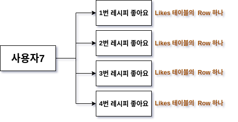 위 그림처럼 Likes는 한 Row에 Member, Recipe를 하나씩만 가질 수 있다. 반면 Member나 Recipe는 여러 개의 Likes를 가질 수 있다.