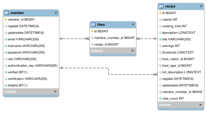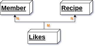 Likes를 중심으로 Recipe, Member와 다대일(N:1)관계로 설정했다.