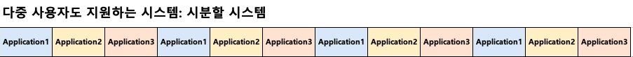 시분할 시스템은 애플리케이션을 잘게 쪼개서 순차적으로 실행한다. 이 방식은 배치 처리 시스템이 가진 문제를 해결한다. 만약 애플리케이션3이 사용자의 입력을 받아서 결과를 출력한다고 상상해보자. 배치 처리 방식이라면 app1과 app2가 모두 끝날 때까지 기다려야 한다. 하지만 시분할 시스템에서는 app1, app2, app3을 나누어서 실행하기 때문에 app1, 2가 실행되는 도중에 결과를 얻을 수 있다.