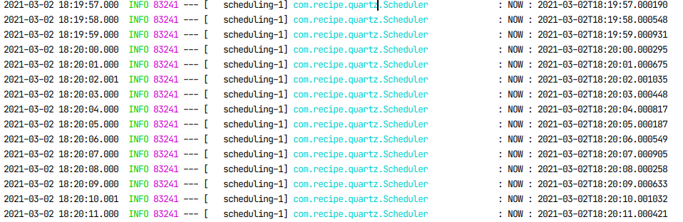 이렇게 하고 애플리케이션을 실행하면 Scheduler가 잘 적용하는 것을 로그를 통해 확인할 수 있습니다.