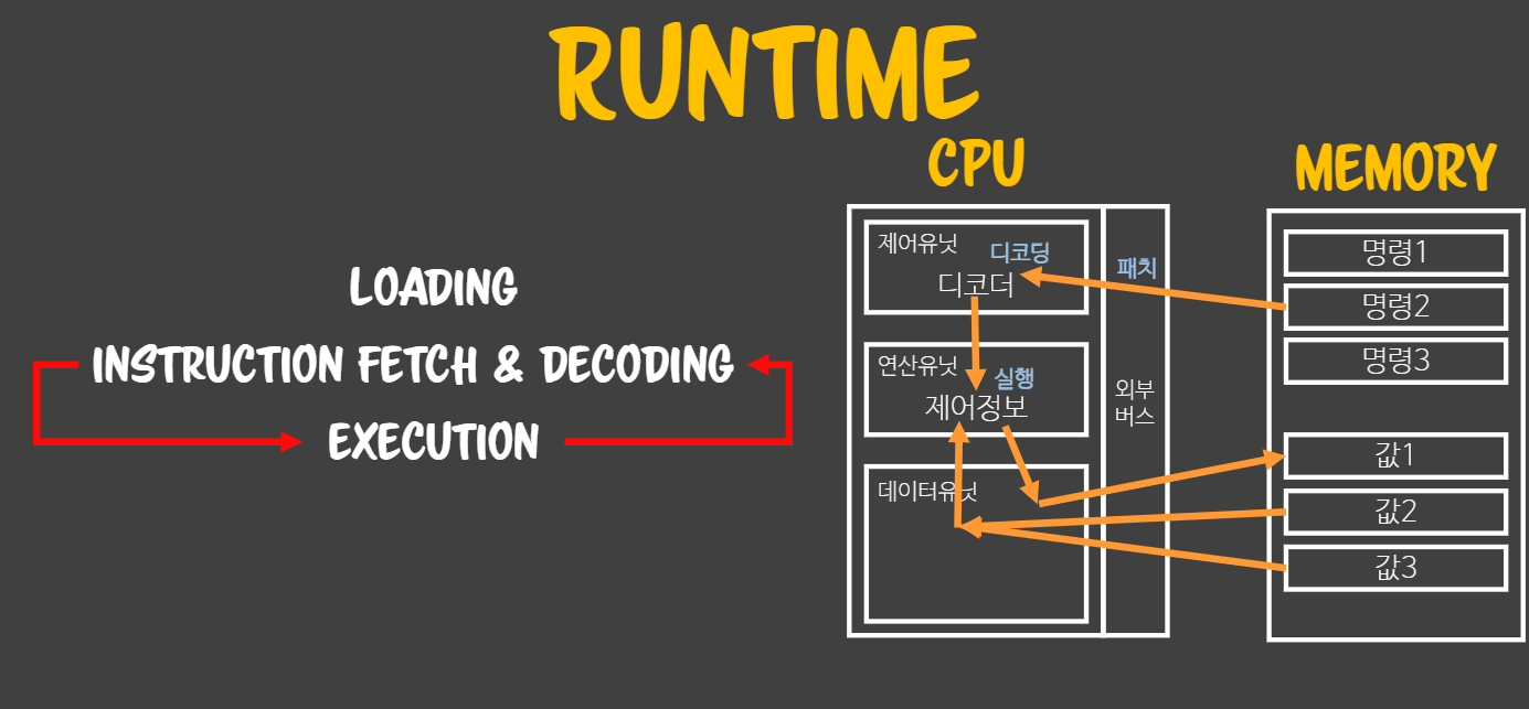 메모리에 명령과 값을 적재하는 과정을 로딩이라고 부른다. 명령(instruction)을 fetch해서 CPU로 가져와 디코딩하여 실행하는 것이 프로그램의 기본적인 구조다. '프로그램'이라고 하면 떠올려야 하는 것은 메모리에 명령과 값이 적재되어 있고 프로그램이 실행되면서 값이 계속해서 갱신되는 것을 떠올려야 한다.