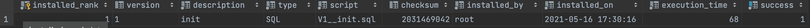 ...이렇게 설정하고 애플리케이션을 실행하면 위에 설명했던 flyway_schema_history라는 테이블이 생성되면서 아래와 같은 필드가 자동으로 추가되고, 테이블도 생성된다.