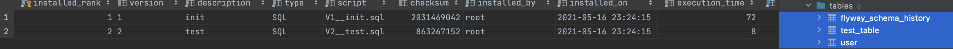 ) engine=InnoDB;이 sql을 /db/migration 밑에 추가하고 서버를 재실행해보면 스키마 히스토리 테이블에 두 번째 버전에 대한 레코드가 추가되고, test테이블도 정상적으로 생성되는 것을 확인할 수 있다.