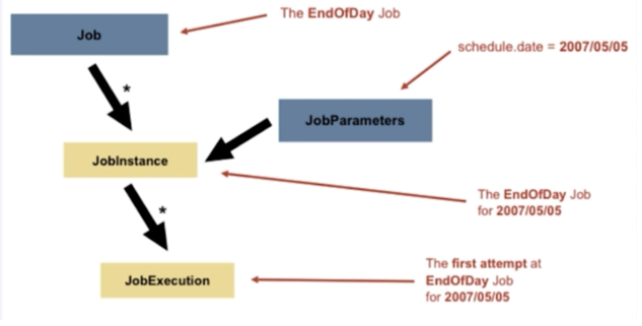 실제로 이 Job을 수행하게 되면 JobInstance 가 만들어진다. JobInstance 는 실제로 Job을 수행할 때 바뀌는 파라미터들을 가지고 만들어진다. 계속해서 위 그림에 빗대어 보면 JobParamters인 schedule.data = 2007/05/05 라는 파라미터를 가지고 JobInstance 가 만들어지는 것이다. 이건 실질적으로 Job이 실행되는 객체다. 이 객체는 2007/05/05라는 파라미터를 받아서 EndOfDay라는 Job을 실행하는 인스턴스로 정의된다.