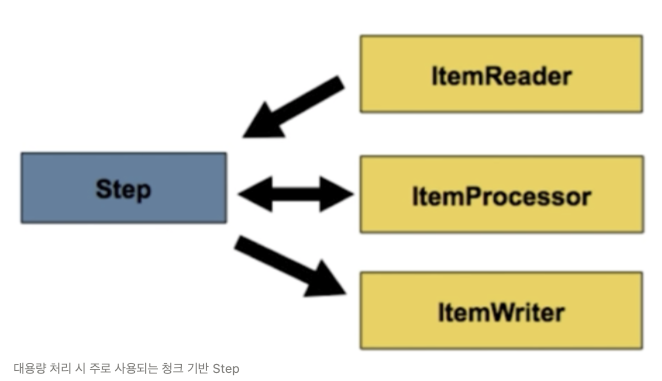 - Step은 배치 작업 단계다. ItemReader, ItemProcessor, ItemWriter는 데이터를 읽고 처리하고 쓰는 구성