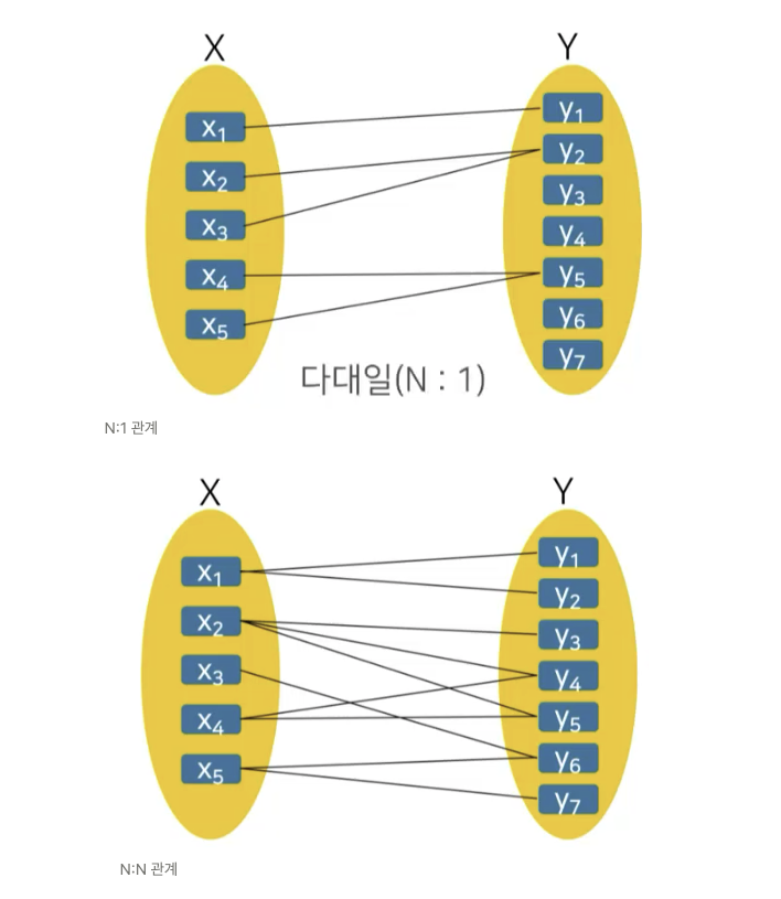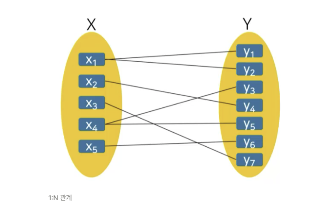 X는 하나의 요소에 두 개이상 관계를 맺고 있지만 Y는 하나에 하나씩만 관계를 맺고 있다. 이런 관계가 1:N이다.