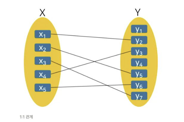 왼쪽 X는 오른쪽 Y와 하나씩만 관계를 맺는다. 반대도 마찬가지다. 이렇게 1:1로 매칭되는 관계를 1:1 관계라고 한다.