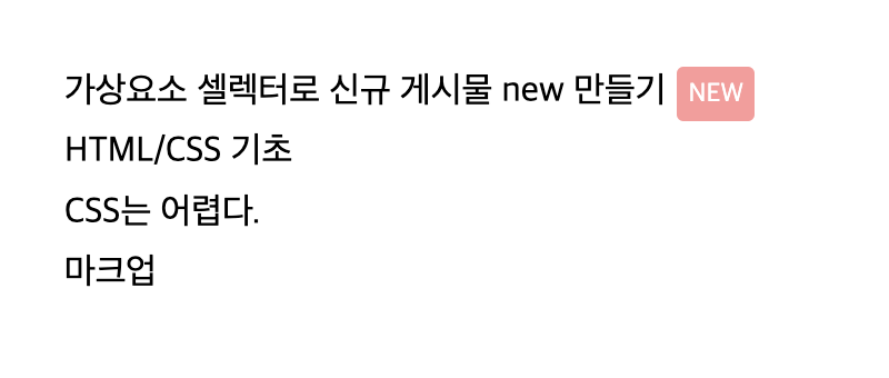 <li class="new">가상요소 셀렉터로 신규 게시물 new 만들기</li>