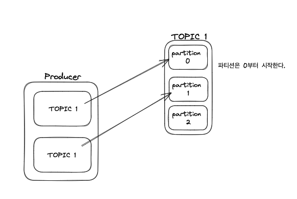 - 토픽은 논리적 개념이고 물리적으로 저장되는 곳은 파티션임. 토픽은 최소 하나의 파티션을 가짐.