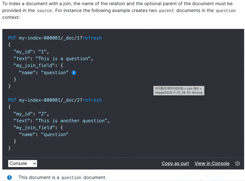 조인을 사용하려면 문서를 인덱싱할 때 릴레이션의 이름과 도큐먼트의 optional parent `source`에 제공해야 함. 예를 들어, 두 개의 `question` 도큐먼트를 만드려면 위와 같은 쿼리를 해야 함.